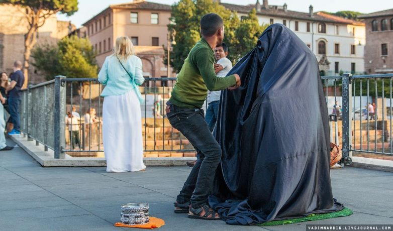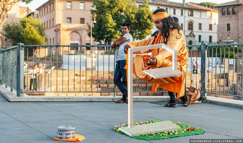 Прогуливаясь в Риме по оживленным туристическим улицам, очень часто можно встретить левитирующих уличных йогов. Судя по реакции некоторых людей, они и вправду верят в сверхъестественные способности этих трюкачей.