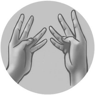 Наложите средний и безымянный пальцы правой руки на аналогичные пальцы левой руки. Вложите мизинец левой руки возле основания среднего и безымянного пальцев правой руки с тыльной стороны. Потом зафиксируйте его положение мизинцем правой руки. Концевую фалангу указательного пальца правой руки зажмите между большим и указательным пальцами левой руки.