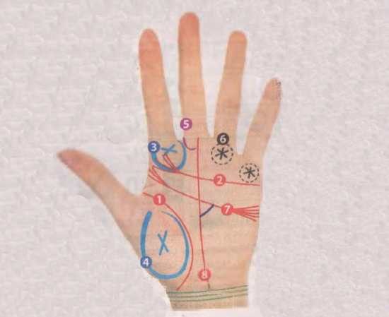 Звездочка, несколько маленьких пересекающихся линий (6) — очень благоприятный знак. Он свидетельствует о том, что человеку сопутствует удача. Расположенная у основания безымянного пальца, звездочка предрекает ему творческие удачи и большие коммуникативные способности, благодаря которым он добьется немалых высот. У основания мизинца — сулит успех в науке, торговле или бизнесе.