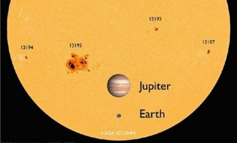 Вот так должно выглядеть “нормальное” Солнце – с пятнами. Изображения Земли и Юпитера добавлены на диск Солнца для сравнения.