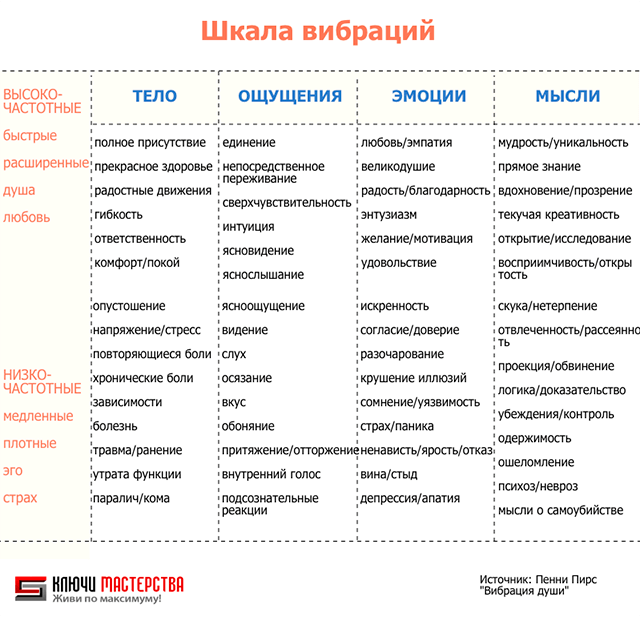 Низкочастотные вибрации включают следующие эмоции: сомнение, уязвимость, страх, ненависть, вину, стыд, ярость, разочарование, депрессию.