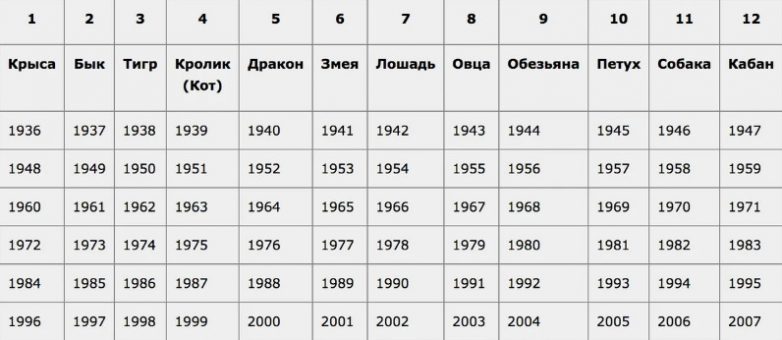 Зная год своего рождения, по Китайскому гороскопу, записываем его порядковый номер. Смотрите таблицу: