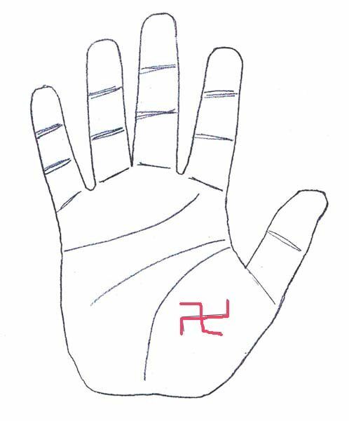 Еще раз посмотрите на свою линию жизни, только теперь устремите взгляд в ее начало. Если от нее идет вертикальная линия, пересекающая линию головы — это хороший знак. Особенно, если она заканчивается небольшим прямоугольником, напоминающим флаг. Этот знак уговорит о том, что вам скорее всего предречена счастливая старость. Нередко у людей с таким знаком есть талант к писательству.Свастика
