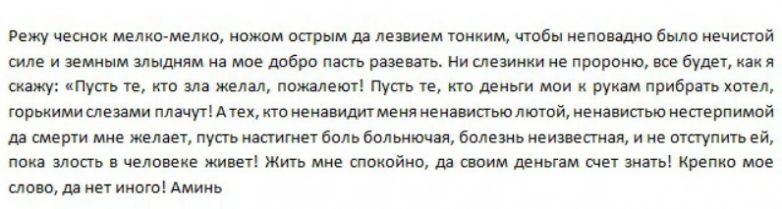 Возьмите головку чеснока, от неё нужно отделить нечётное количество долек. Все их нужно мелко нарезать ножом, при этом говорить слова заговора: